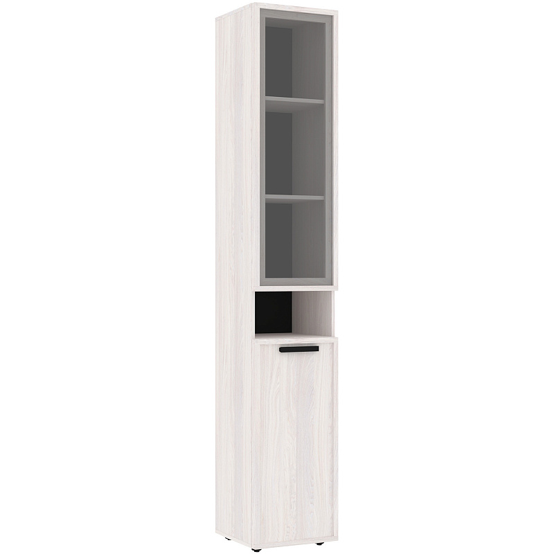 Высокий шкаф для хранения идеально подходит для комнаты подростков, в которой слишком много разнообразных и таких "нужных вещей". Верхний рамочный фасад с тонированным стеклом открывается за раму, нижний фасад Контур открывается за серую ручку из массива. Верхний и нижний фасады можно перенавесить на левую и на правую стороны.