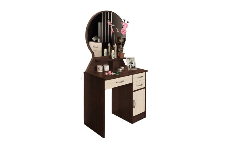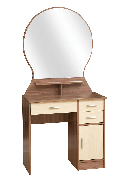 Туалетный стол «Надежда-М04» – эстетичный предмет интерьера, обеспечивающий пользователю комфортные условия для поддержания ухоженного внешнего вида. Круглое зеркало гармонично вписывается в общую конструкцию. Три выдвижных ящика и боковая секция с распашными створками предоставляют возможность хранения большого количества косметики, предметов ухода за лицом и средств гигиены. Под зеркалом установлена полка для расположения изящных вещей. Свободная ниша слева обеспечивает удобное размещение человека в положении сидя.
