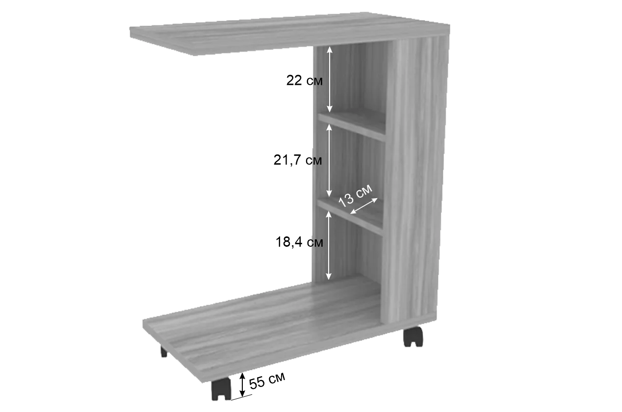 Состоит из: стола с 2-мя полками, на колесиках. Изделие симметричное.