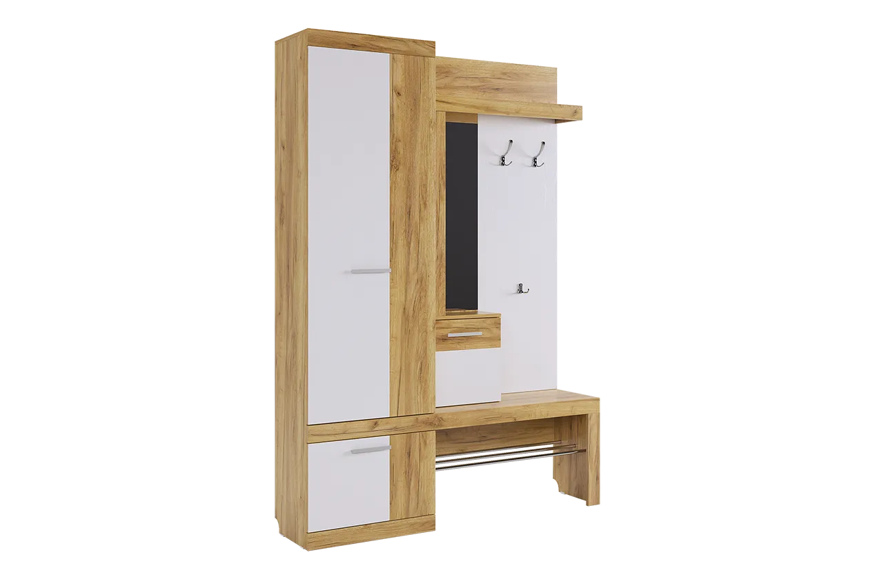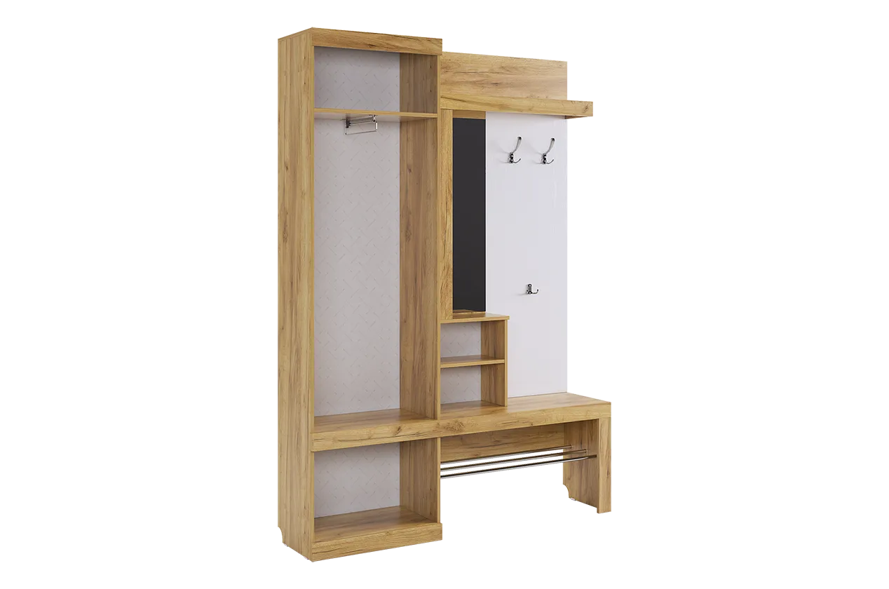 Прихожая Алекс включает в себя три основных блока. Открытые ниши предлагают место для размещения одежды и сумок на металлические крючки. Элегантное решение с хромированными трубками идеально подходит для хранения повседневной обуви. Закрытый шкаф-гардероб обеспечивает дополнительное пространство для несезонной обуви и верхней одежды. Ниша-трюмо с зеркалом и боковыми полками делает утренний уход удобным и быстрым. Закрытый шкаф под зеркалом предлагает дополнительное пространство для хранения различных аксессуаров.