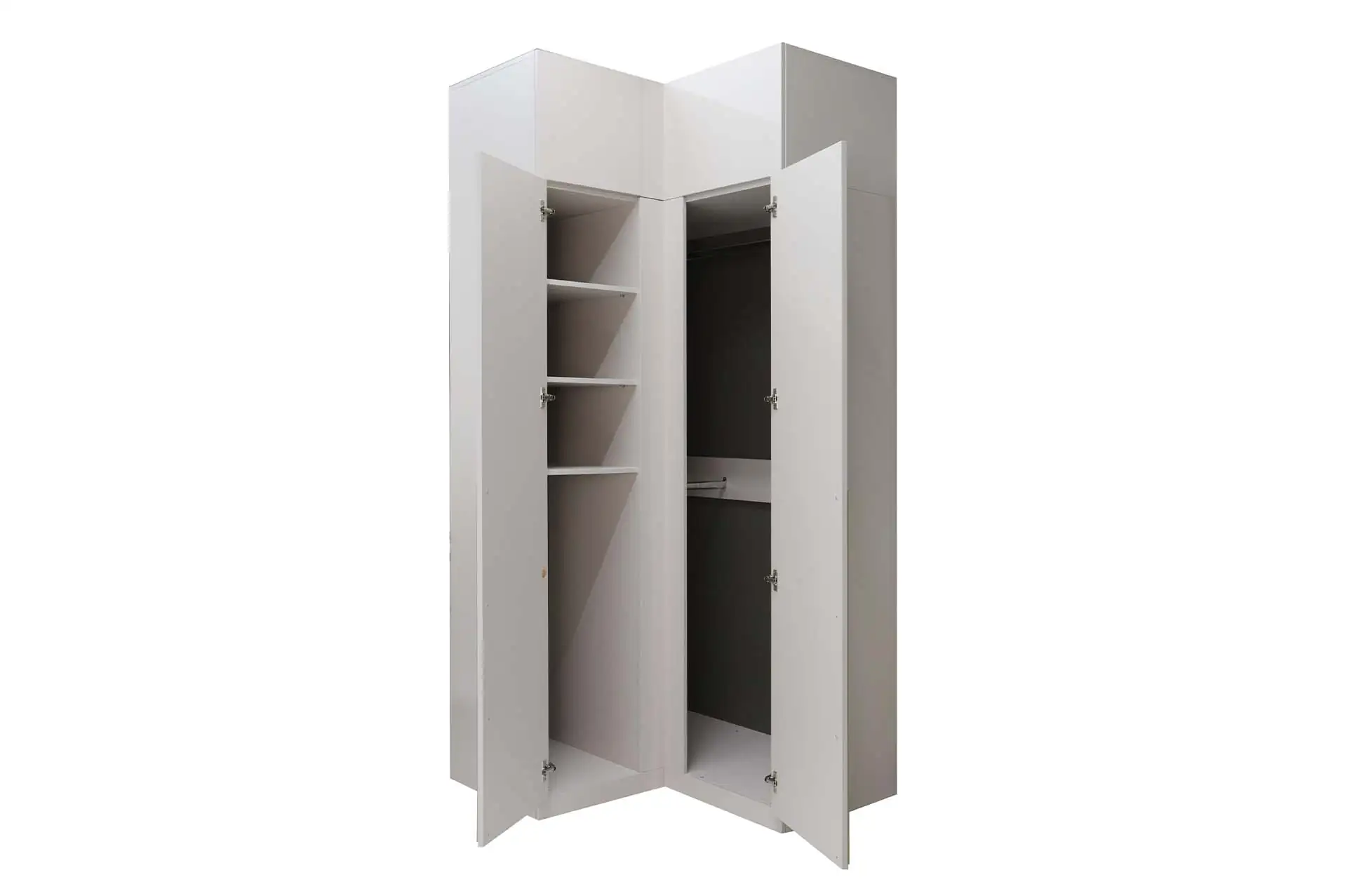 Вместительный угловой шкаф с двумя створками превращает неприметные уголки комнаты в просторное хранилище. Позволяет разместить значительно больше вещей, чем стандартные прямые модели. Оборудован штангами и полками. Возможно дополнительно укомплектовать секцией с ящиками “Николь 29.1”.