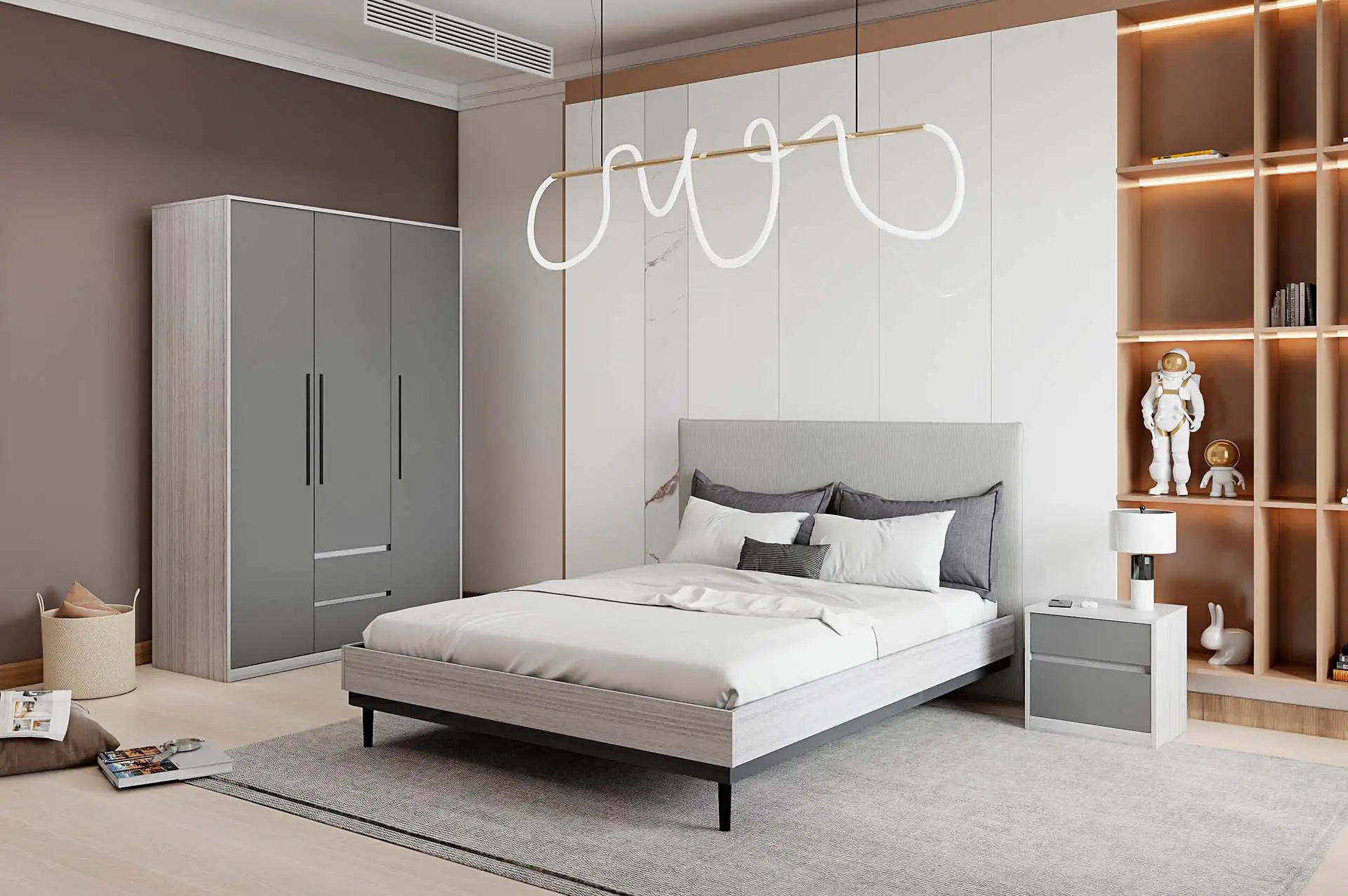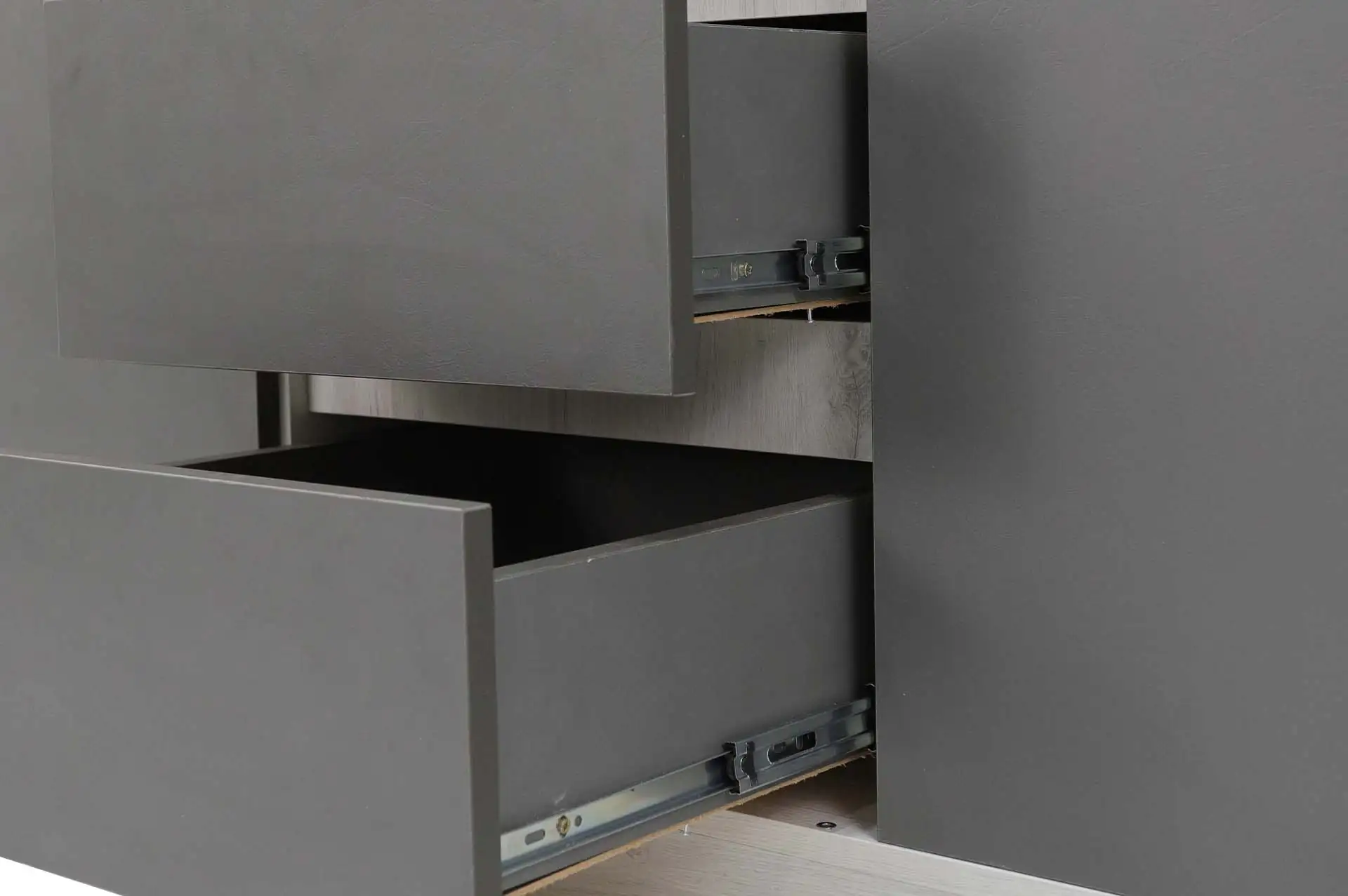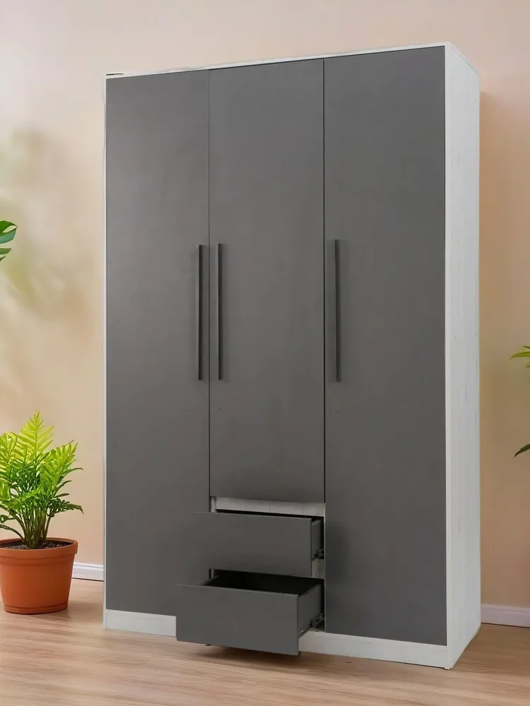Распашной трехстворчатый шкаф оснащен всем необходимым для организации хранения вещей: штангой, полками и выдвижными ящиками. Сочетание современных трендовых фактур, стильный графитовый цвет придают особый шарм интерьеру.