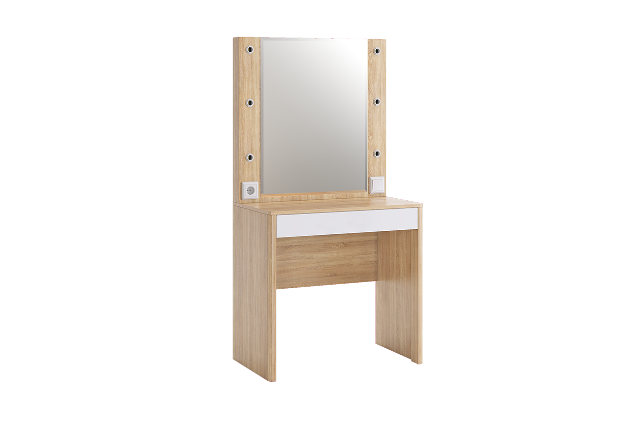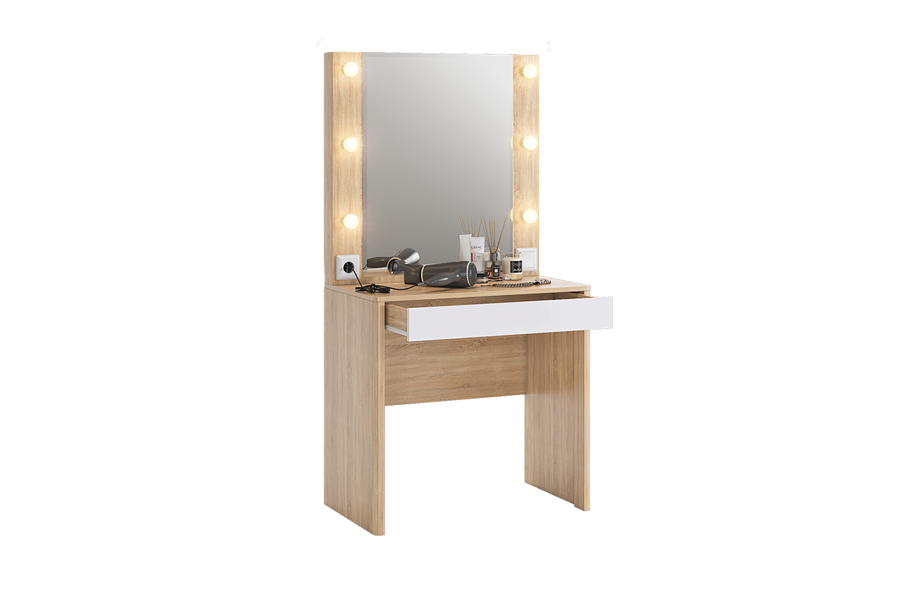 Оригинальное и стильное трюмо из серии «Зара». В зеркало с широким фацетом, встроена подсветка, как в столах профессиональных визажистов. Дополнительно имеется выключатель, розетка для фена и выдвижной ящик для украшений и косметики. Закругленные углы, подчеркивают общий стиль коллекции.